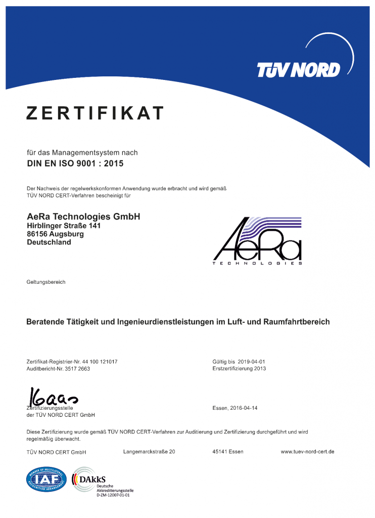 Unser Unternehmen ist zertifiziert nach der DIN EN ISO 9001:2015 für Beratende Tätigkeit und Ingenieurdienstleistungen im Luft- und Raumfahrtbereich.
